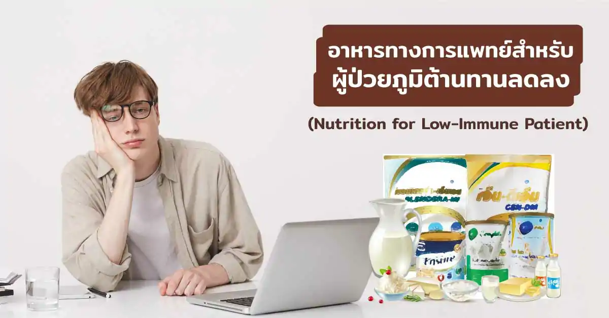 อาหารทางการแพทย์สำหรับผู้ป่วยภูมิต้านทานลดลง (Nutrition for Low-Immune Patient) เป็นอาหารสูตรครบถ้วนที่ออกแบบมาเพื่อเสริมภูมิคุ้มกันและให้พลังงานสูง เหมาะสำหรับผู้ป่วยมะเร็งหรือผู้ที่ได้รับการรักษาด้วยเคมีบำบัดและสเต็มเซลล์ซึ่งมักมีภูมิคุ้มกันต่ำ อาหารสูตรนี้มีโปรตีนและกรดอะมิโนจำเป็นในปริมาณสูง เสริมด้วยกลูตามีน อาร์จีนีน และน้ำมันปลา เพื่อช่วยซ่อมแซมร่างกายและเพิ่มการต้านทานโรค นอกจากนี้ยังมีวิตามิน แร่ธาตุ และใยอาหารจากผักผลไม้ที่ช่วยต้านอนุมูลอิสระ ทำให้ผู้ป่วยได้รับสารอาหารครบถ้วนแม้ในช่วงที่กินอาหารได้น้อย